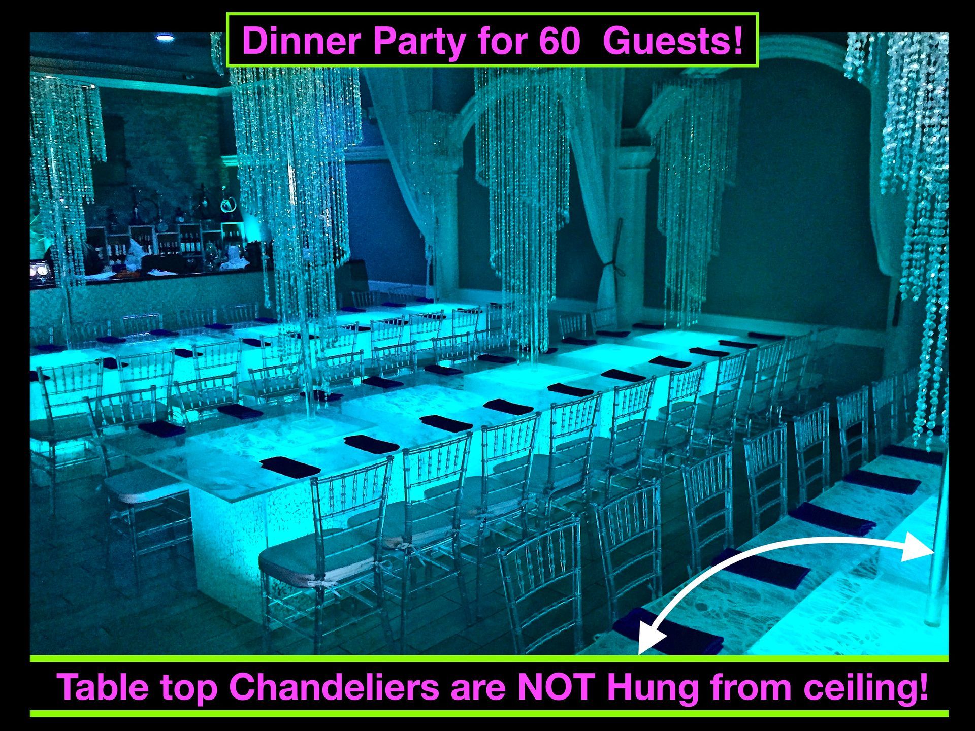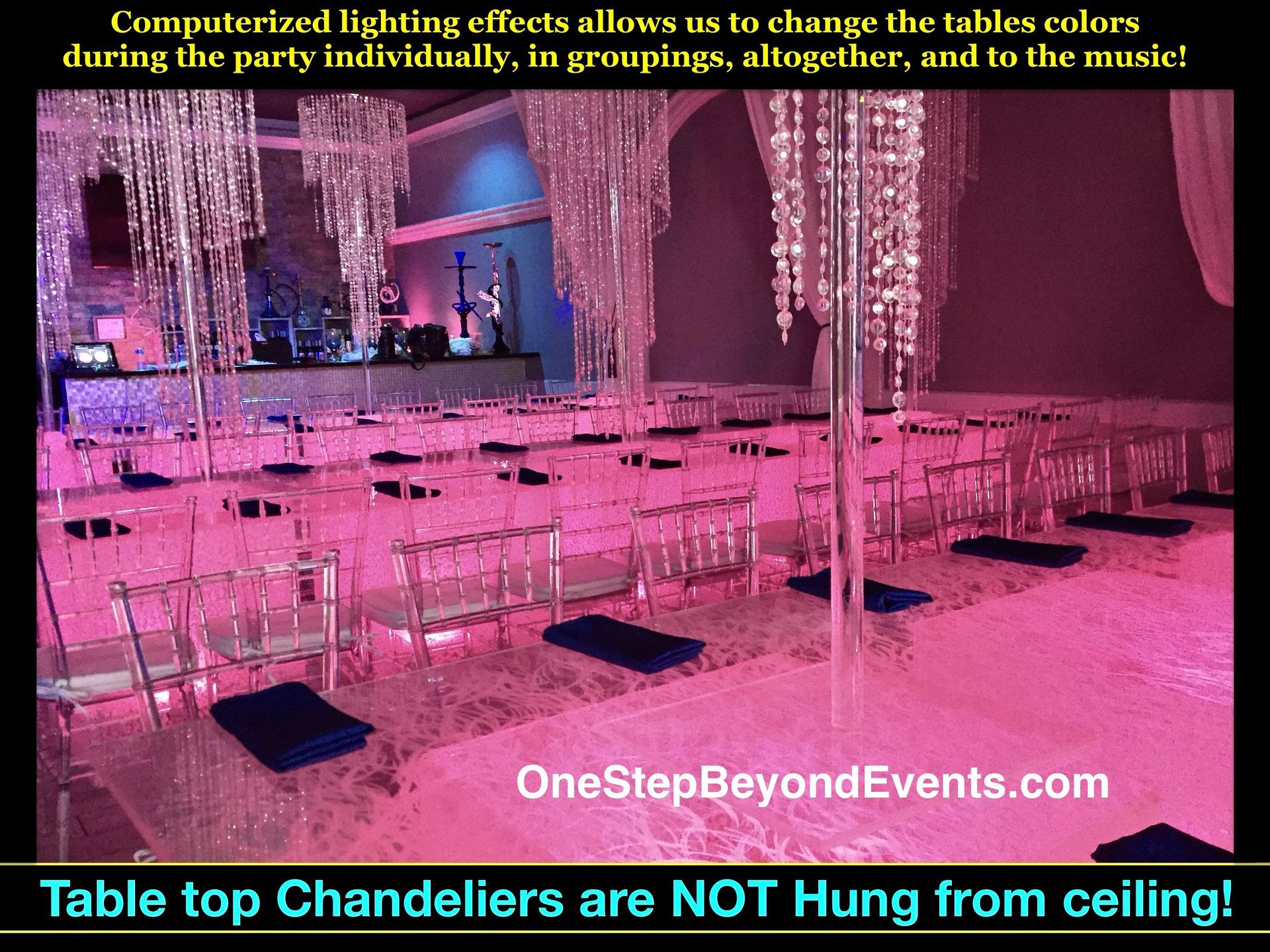 Tent rental colorful lighting rental & installation. Tent rental draping installations. Uplighting & Downlighting for tent rentals. illuminated chandeliers for Tent rentals. LED light up Chandeliers suspended from tent frame illuminate any tent rental. LED tables are spectacular for tent rentals. Lighted tables magically illuminate your tent rental. Light Up tables are stunning for tent rentals. Glow tables add color for tent rentals. Led Bars add style for tent rentals. Lighted Bars are magnificent for tent rentals. Light Up Bars are fabulous for tent rentals. Glow Bars are amazing for tent rentals. Lounge Decor is the new style for tent rentals. Lounge Furniture Decor is what's next for tent rentals. Stages & staging for tent rentals. LED Stages & staging are beyond description for tent rentals. Lighted stages & staging is spectacular for tent rentals. Dance floors for tent rentals. White dance floors for tent rentals. Tent rental lighting. Rental Feather centerpieces are being replaced with 6' tall chandelier centerpieces. Feather centerpieces have been seen by all & 6' tall light up Chandeliers are what's new & better! Say no to feather centerpieces & yes to 6' tall chandelier centerpieces for your sweet 16, Mitzvah, Wedding or Party! It's time to replace feather centerpieces with 6 foot tall LED Lighted Chandelier centerpieces!